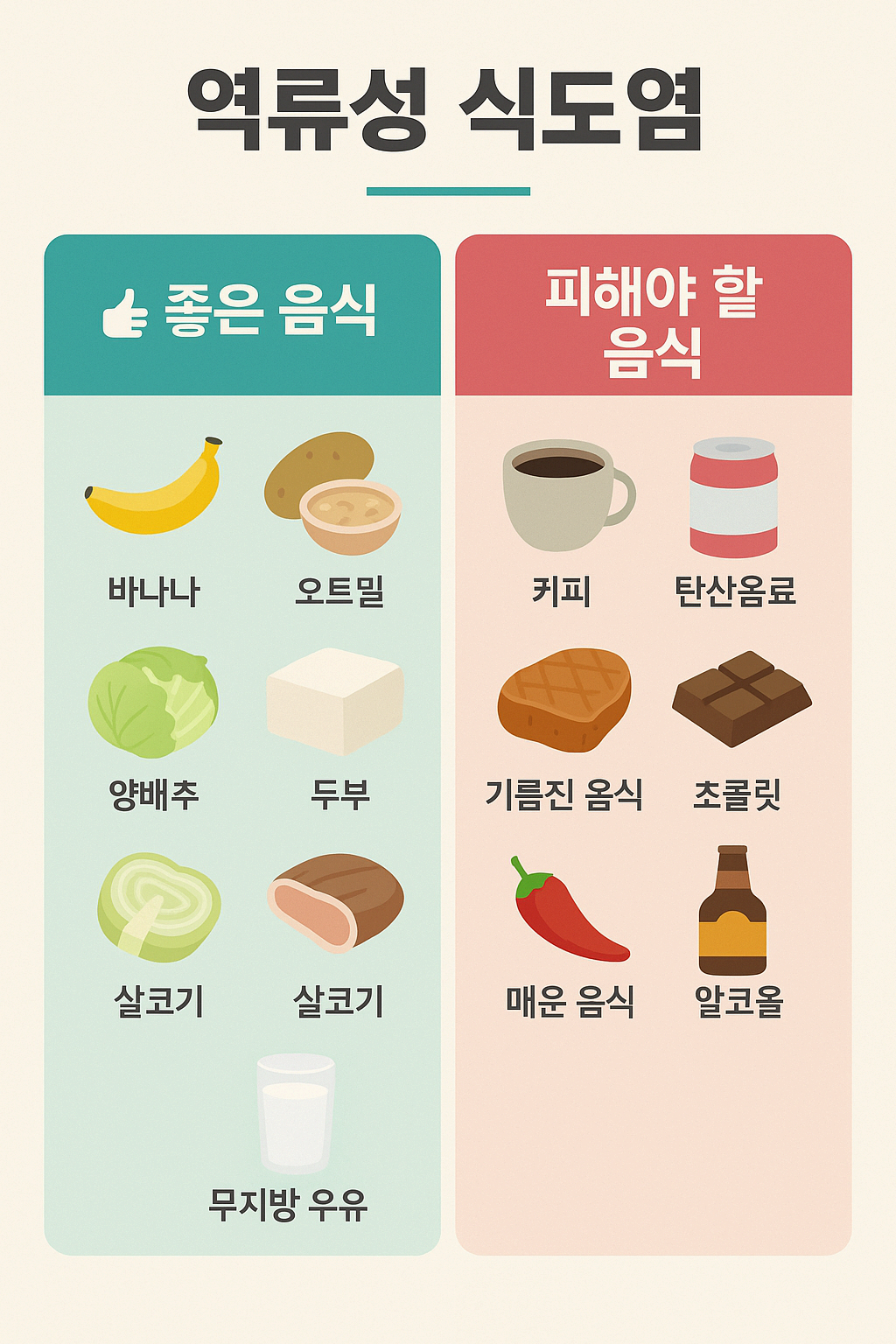 역류성 식도염(GERD, Gastroesophageal Reflux Disease)은 위의 내용물(위산·음식물)이 식도로 역류해 식도 점막에 염증이 생기는 질환이에요.